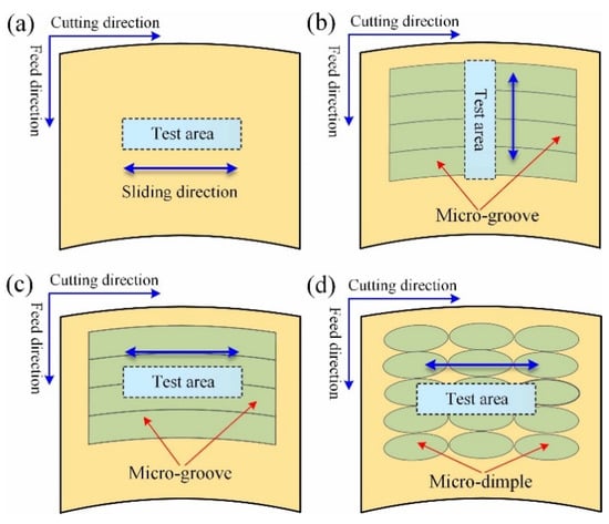 Referring to previous research results, the optimized combination of processing parameters (from entry #1 to entry #4) used for fabricating the specific four micro-textured surfaces are summarized in Table 1. For the convenience of the subsequent analysis and description, the micro-textured surfaces corresponding the processing parameters of entries #1, #2, #3, and #4 are respectively defined as surface #1, surface #2, surface #3, and surface #4 in turn. As an experimental comparison, two other surfaces were also prepared. One is a surface fabricated by the turning on the same experimental platform without ultrasonic vibration, and the corresponding processing parameters were listed in entry #5 of Table 1. Except for the vibration parameters, the other processing parameters are the same as entry #1. The surface is defined as surface #5. The other surface is a polished surface, which is defined as surface #6.