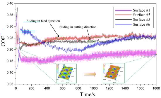 For surfaces #1, #5, and #6, the corresponding variation curves of COF within 30 min can be seen in Figure 10. The pink curve represents the COF of micro-dimpled surface #1, the red curve represents the COF of micro-grooved surface #5 sliding in the feed direction, the black curve represents the COF of micro-grooved surface #5 sliding in the cutting direction, and the blue curve represents the COF of polished surface #6. It can be seen that the curves of COF for the four surfaces all go through a running-in stage and then enter a stable stage. For the COF of polished surface #6, it takes a relatively long time to enter the stable stage, which is different from that of the micro-grooved surfaces. When the test time goes on for about 25 min, the curves of COF for the polished surface and micro-grooved surface gradually tend to be consistent. Through measuring the COF in the stable stage, the average values of surface #1, surface #5 (sliding in the feed direction), surface #5 (sliding in the cutting direction), and surface #6 are 0.170, 0.254, 0.237, and 0.232, respectively. The COF of micro-dimpled surface #1 is obviously smaller than that of the micro-grooved surface and polished surface, which can be respectively reduced by 33.1%, 28.3%, and 26.7%. Compared with the micro-grooved surface, when ultrasonic vibration is applied to the depth direction of turning under the same processing parameters, the specific continuous micro-dimples fabricated on the surface can greatly improve the friction performance. As shown in Figure 10, the previous continuous micro-dimples in the cutting direction have changed into the discrete dimples after the friction test, and the flat part between the residual dimples corresponds to the worn surface.