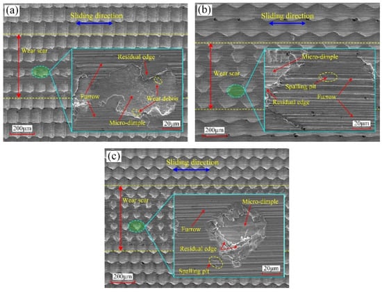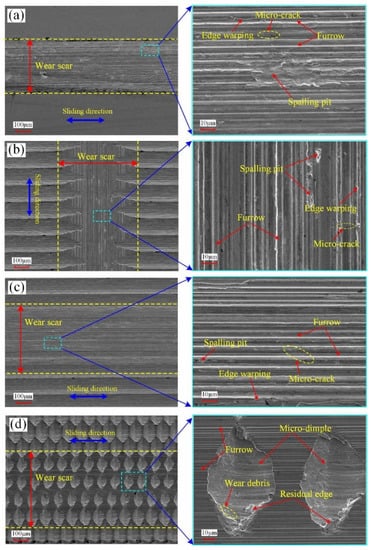 In order to further analyze the wear behaviors of the four surfaces during the sliding process, the corresponding SEM micrographs of surface worn morphology were observed, which can be seen in Figure 11. It can be found that the four surfaces all have a certain degree of wear. For the two micro-grooved surfaces sliding in different directions, the micro-grooves with a depth of 8.7 μm in the middle of the test area were totally smoothed out, and the relevant wear state is basically the same as that of the polished surface, as shown in Figure 11a–c. The furrow, spalling pit, micro-crack, and edge warping all exist on the worn area of surfaces #5 and #6. In addition, by observing the friction balls corresponding to the different worn surfaces, brass materials all adhere to the tribo-surface of the friction ball to varying degrees. It can be inferred that the adhesive wear, abrasive wear, fatigue wear, and plastic deformation probably exist in the sliding process. As can be seen from Figure 10, for polished surface #6, the COF increases first; then, it gradually decreases and then continues to gradually increase to the stable stage. In the initial friction contact process, the COF is small due to the existence of oxide film and boundary lubrication film on the polished surface. As a result of the contact of convex peaks, the oxide film is destroyed, and the COF increases rapidly. As the reciprocating sliding process progresses, the boundary lubrication film between the tribo-contact surface tends to be stable, and the COF tends to gradually decrease. However, as the reciprocating sliding process continues, there is a certain degree of adhesive wear between the tribo-contact surface, and the brass materials adhere to the surface of the friction ball, which leads to the increase in wear debris. Under the action of reciprocating contact stress, the wear debris has a greater ploughing effect on the surface, resulting in the furrows and edge warping. The boundary lubrication film is gradually destroyed to a certain extent. In addition, the worn area begins to appear micro-cracked, even the spalling pit, which leads to the increase in COF. Finally, the tribo-contact surface reaches the stable stage, which is the same as that of the micro-grooved surface. For surface #1, although a certain degree of surface wear also exists in the test area, there are still some residual micro-dimples with a regular size and uniform distribution on the surface, as shown in Figure 11d. The worn area of surface #1 mainly has a shallow furrow, and the spalling pit and micro-cracks have not been produced in the sliding process. Therefore, the wear degree of surface #1 is much smaller than that of the polished surface and micro-grooved surface. It shows that the continuous micro-dimples fabricated by 1D UVAT play a positive role in reducing the wear under the oil lubrication with low speed and light load. On the one hand, the evenly distributed micro-dimples have a good ability of oil storage in the reciprocating sliding process, which can continuously provide enough lubricating oil for the contact part of the tribo-surface to reduce the frictional resistance. Even if the supply of lubricating oil is not timely, the lubricating oil stored in the residual micro-dimples can make the tribo-surface be in a self-lubricating state within a certain time. On the other hand, as shown in Figure 11d, the wear debris produced in the reciprocating sliding process can be captured and contained by the micro-dimples, which is helpful to reduce the wear degree caused by abrasion. In addition, through observing Figure 11d, it is found that the part of the residual edge is depressed into the micro-dimples. Therefore, the micro-dimples can also store the residual edge to avoid the aggravation occurrence of plastic deformation and wear caused by the entrance of broken parts into the tribo-contact surface.