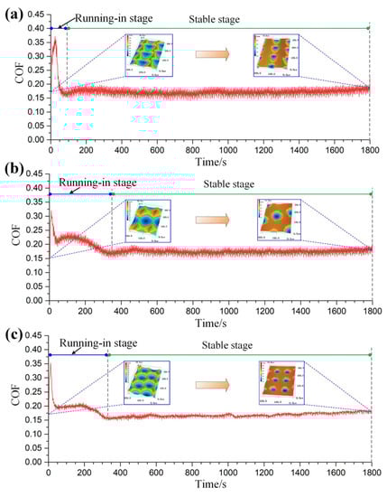Variation curves of COF corresponding to the other three micro-textured surfaces: (a) surface #2; (b) surface #3; (c) surface #4.