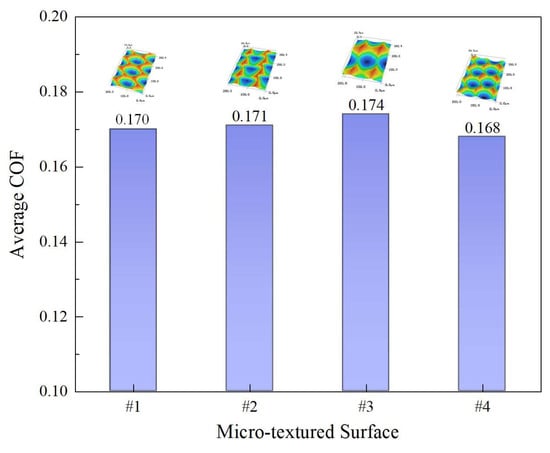 Under the same test conditions, the COF curves and 3D topographies of the worn area corresponding to surfaces #2, #3, and #4 can be respectively seen in Figure 12. The three micro-dimpled surfaces all have undergone the running-in stage and then finally reached the stable stage during the sliding process. The residual micro-dimples are also evenly distributed on the worn surface. As shown in Figure 13, the average values of the COF in the stable stage corresponding to surfaces #2, #3, and #4 are 0.171, 0.174, and 0.168, respectively. Compared with surface #1, the average COF and the curve fluctuation degree of surface #2 have little change. As for the micro-dimples fabricated by 1D UVAT, the dimple shapes (scale-like and oval-like) and dimple depth have little effect on the friction performance under the current test conditions. In order to further observe the wear behaviors of the three surfaces during the sliding process, the corresponding SEM micrographs of surface worn morphology can be seen in Figure 14. For surface #2, the main form of surface wear is furrow. For the surfaces #3 and #4, except for the furrow, a spalling pit is also produced on the worn area. Among them, the furrow produced on surface #3 is more obvious. Due to the increase in distance between two adjacent dimples in the cutting direction, the number of micro-dimples involved in the storage of lubricating oil and debris is reduced, which leads to a certain enhancement in the degree of abrasive wear and plastic deformation. Consequently, the average COF of surface #3 in a stable stage becomes larger than that of surface #1. For surface #4, as the distance between two adjacent dimples in the feed direction decreases, the number of micro-dimples involved in the storage of lubricating oil and debris is increased. As a result, the friction performance of surface #4 has been improved, and the corresponding average value and fluctuation range of COF are also decreased accordingly. The above analysis of the friction performance mainly focuses on the effect of the surface micro-textures. Referring to the previous studies [,], the plastic strain and grain refinement produced in the subsurface can lead to the work-hardening, which is beneficial for the friction performance. By observing the subsurface microstructure in Figure 6, it can be inferred that the elastoplastic deformation and corresponding elongation of grains may also cause the surface hardening, which may be beneficial for the friction performance of the micro-textured surface. Therefore, in addition to the surface texturing effect, the potential effect of surface hardening on the friction performance should be considered in future research.