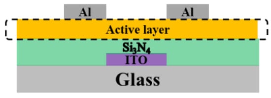 A semiconductor precursor solution was prepared using Indium nitrate hydrate (In(NO3)3·5H2O, CAS No.: 13465-14-0), in a solvent of ethylene glycol monomethyl ether (2-MOE, CAS No.: 109-86-4). The precursor solution was stirred in a magnetic mixer for 30 min and filtered, and then ultrasonic treatment was performed for 10 min. After plasma surface treatment, 35 μL of In2O3 precursor solution was added dropwise to the single-crystal silicon (CAS No.: 7440-21-3), and then spin coated with a homogenizer (model: KW-4A) at the speed of 4000 rms for 30 s. In the multilayer spin-coating process, every single-layer was pre-annealed at 100 °C for 10 min to evaporate the solvent. Finally, the In2O3 films were annealed at 200 °C, 225 °C, 250 °C, 275 °C and 300 °C for 45 min respectively. For the fabrication of In2O3-TFTs, bottom-gate devices were fabricated on Al (CAS No.: 7429-90-5) gate electrode and Si3N4 (CAS No.: 27198-71-6) dielectric layer. After the deposition of In2O3 thin films, an Al source and drain electrodes were formed by magnetron sputtering through a shadow mask. The schematic structure of the In2O3-TFTs is shown in Figure 1.