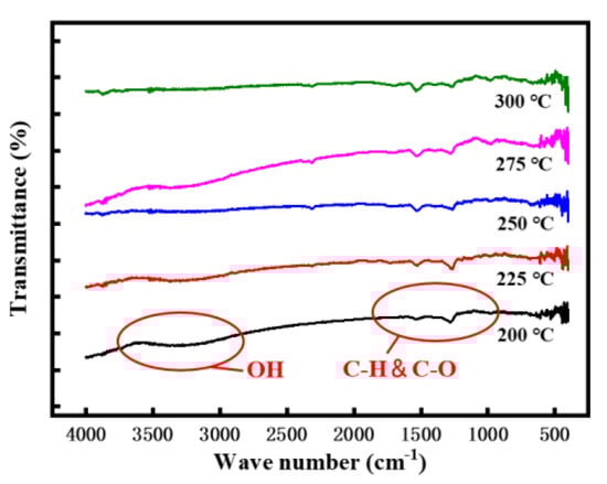 Figure 3 shows the FT-IR test curves of In2O3 thin films prepared at different annealing temperatures. The absorption peak located at 2750 cm−1 to 3750 cm−1 is the stretching vibration of O–H bond [], The absorption peak at 1250 cm−1 to 1750 cm−1 were caused by the bending vibration of the carbon–hydrogen bond and carbon–oxygen bond []. The absorption peak at 500–700 cm−1 can be attributed to the stretching vibration of the In–O bond. The O-H bond mainly comes from [In (OH)](3−x)+, and the hydrolysis reaction of precursor is as follows []: