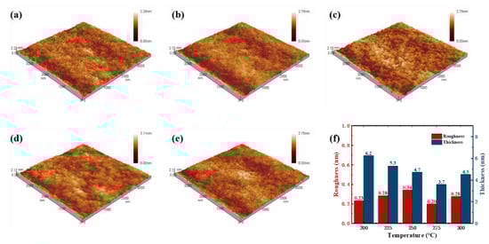 Atomic force microscopy (AFM) 3D images (4.0 × 4.0 µm2) of In2O3 thin films annealed at different temperatures: (a) 200 °C, (b) 225 °C, (c) 250 °C, (d) 275 °C, (e) 300 °C, respectively. (f) The surface roughness and thickness of these films.