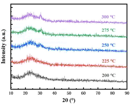 In our previous studies, it was found that In2O3 thin films crystallized only at temperatures above 400 °C []. Therefore, we only studied the crystallization of In2O3 thin films at 200–300 °C in this work. It can be seen from Figure 5 that as the annealing temperature increases, a diffraction peak related to cubic In2O3 gradually appears in the film around 31°, which indicates an increased transformation from amorphous phase into crystalline phase. According to the test results, when the temperature is 275 °C and below, the diffraction peak has a large full width at half maxima (FWHM), weak intensity, and extremely low crystallinity, which indicates that the In2O3 thin films prepared by the spin coating can maintain an amorphous structure at this annealing temperature. The amorphous In2O3 thin films can achieve better flatness and uniformity than crystalline films, and is conducive to the control of carrier concentration [].