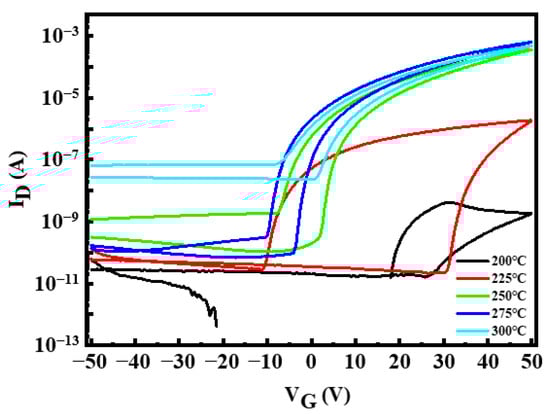 It can be seen from Table 1 that the Vth of In2O3-TFTs gradually negative shift with the increase of annealing temperature, which is the minimum (0.84 V) at 275 °C. Also, the Ion/Ioff first increased to a peak value (5.93 × 106) at 275 °C, and then decreased. Furthermore, the saturation mobility (μsat) and subthreshold swing (SS) reached the maximum (1.288 cm2·v−1·s−1) and the minimum (1.030 V·dec−1) at 275 °C respectively. The performance is similar to that of In2O3-TFTs prepared by Choi at 280 °C (μsat of 2.4 cm2·v−1·s−1, Ion/Ioff of 106) []. According to the FT-IR results, the low carrier concentration inside the In2O3 films at low annealing temperature may be due to the existence of undecomposed metal hydroxides in the active layer in the form of various defects, leading to the low μsat, low Ion/Ioff, large Vth and large SS. When the annealing temperature increased from 200 °C to 275 °C, the devices performance gradually improved. However, when the annealing temperature reached 300 °C, the carrier concentration in the In2O3 thin films was too high, which made the device unable to turn off normally, thus, the Ion/Ioff was only 7.27 × 103. In addition, the continuous increase of temperature may lead to the degradation of the interface quality of the device, leading to the decrease of other performance.