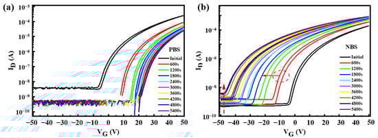 Transfer curves of In2O3-TFT annealed at 275 °C under (a) positive gate bias stress (PBS) and (b) negative gate bias stress (NBS). Measurement conditions: VDS = 20 V at room temperature.