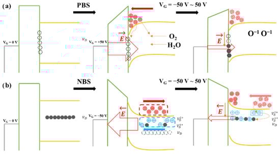 Similarly, Vth had a drift of −45 V under NBS, as shown in Figure 7b. In addition, with the increase of NBS time, the Ioff increased and the hysteresis phenomenon became more obvious, which indicated that there were more defects in the In2O3 active layer, or the adsorption of water and oxygen was more serious. This was due to the activation of a large number of donors under NBS, such as impurities in the In2O3 films, and these electrons were removed from the active layer by the electric field. At the same time, the donors were positively charged after losing electrons, which were absorbed near the In2O3/Si3N4 interface. When the bias voltage changed from −50 V to 0 V, the electric field cannot remove all the electrons generated out of the channel. Also, most of the electrons were not easy to compound with donor-like vacancies, but directly formed channel current under voltage, resulting in a negative Vth, as shown in Figure 8b.