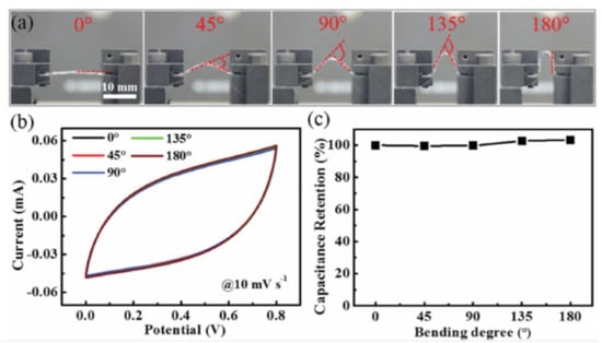 Guo et al., developed a wire-type supercapacitor with a parallel double helix structure (PDHS) for stable operation even under deformed states [47]. They wrapped two symmetrical titanium @MnO2 (Ti@MnO2) fiber electrodes around flexible nylon fiber and separated them by a spatial gap filled with LiCl/PVA gel as the electrolyte. A commercially available metal Ti fiber with high conductivity was used as current collector and MnO2 was electrochemically deposited as active material for the cathode and anode. Figure 3a depicts the mechanical and electrochemical stability of PDHSs at different angles (0–180°). The CV curves (at a scan rate of 10 mV s−1) in the bent state are almost the same as shown in Figure 3b. The capacitance change is less than 1% for bends from 0 to 180° (Figure 3c). This structure allows two parallel, twisted fiber electrodes to remain physically separated during bending, ensuring mechanical stability [47].