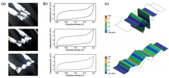 The origami-based approach represents another alternative that allows deformability compared to conventional methods using freely deformable materials and mechanically designed structures. Origami is the ancient art of folding 2D sheets of paper with advanced folding along predefined creases and can be used to fabricate flexible and compact 3D structures [48]. Nam et al., fabricated an origami-based, all-solid-state, bendable supercapacitor system, assembling the analog of a series circuit [49]. This supercapacitor consisted of periodically isolated electrodes (IEs) and sectionalized electrolytes. These are important elements of a single system for the densely packed series circuit analogs. The sectionalized electrolytes and IEs were produced by easily designing with a graphite rod onto a paper substrate. The sectionalized ion transferring paper (SITP) substrate exhibits stable folding characteristics that are natural for ordinary paper. The characteristics of SITP allow origami construction. As shown in Figure 4a, Nam et al., produced three IE samples featuring seven bent in layers with a wavy pattern and confirmed their electrochemical properties. The results indicate a close CV graph under compression (60%), planar and tensile deformation (30%) conditions with specific capacitances of 0.94, 0.98 and 0.93 mF/cm2 according to each deformable state in Figure 4b. Furthermore, they demonstrated the numerical analysis of stress distribution through modeling to represent the mechanical properties of each sample (Figure 4c) [49].