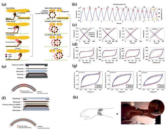 (a) Paradigms for the gradual motion of carbon nanotubes (CNTs) along with graphene in an inorganic system and of myosin along actin in a living cell. (b) The galvanostatic charging-discharging (GCD) curve for the graphene/CNT layers on polyvinyl alcohol (PVA)/H3PO4 film at a constant current (0.15 A/g) while stretching the structure at a steady rate of 0.4% strain per minute. (c) Representative GCDs at several current densities (from 0.15 to 0.75 A/g) without strain and with twisting (360°) and stretching (80%). (d) Representative CVs at diverse scan rates (from 1 to 10 mV/s) without strain and with twisting (360°) and stretching (80%) [55]. Copyright (2017), Biomaterials. (e) Bending deformation states of energy storages and schematic drawing of an exoskeleton energy storage system. (f) Endoskeleton energy storage system. Stretching features of endoskeletons with hexagonally located pore structures and electrochemical properties of the device. (g) Representative CVs at 0.1, 0.3 and 0.5 mV/s. (h) Employment of the endoskeleton system in a micro-LED device on a wrist [46]. Copyright (2016), Journal of Materials Chemistry.