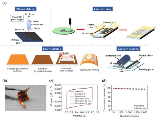 Liu et al., developed carbon-type flexible all-solid-state MSCs using a mask-free plasma etching method, the schematic illustration is given in Figure 6a. CNT electrode and PVA/H3PO4 gel polymer electrolyte were used. They compared interdigitated SCs and conventional sandwich SCs using the same electrodes with the former exhibiting higher capacitance [68]. The power and energy densities could be handled easily by changing the dimension of interdigitated electrodes per unit area. The MSC with 12 electrodes demonstrated a capacitance of 2.02 F/cm3 (scan rate = 10 mV/s). The capacitance stayed at 94.1% after 6000 GCD cycles and showed stable performance with capacitance retention of 98.2% over 600 bending cycles [61]. El-Kady et al., fabricated MSCs on flexible substrates using laser-scribed graphite oxide (LSG) electrodes, which are very deformable and can be twisted and bent without influencing the structural integrity of the device. The laser scribing process utilizes changes in electrical properties, optical properties, and film structure. Figure 6b shows the mechanical performance of the LSG-MSC under strain and Figure 6c shows the CV characteristics of an MSC for various bending and twisting conditions at 1000 mV/s with the data demonstrating electrochemical stability and excellent mechanical stability irrespective of the degree of bending or twisting. As shown in Figure 6d, the flexibility and stability of the device was examined during bending and twisted state and the capacitance was reversible and the initial capacitance was sustained at 97% after 2000 cycles [68].