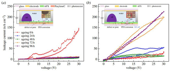 Leakage current measurements with stepwise applied voltage at different thermal aging testing conditions for (a) bilayer AFX (Teflon® AF series)/ParyleneC. (b) Single AFX (AFX: 1359 nm) device. The corresponding microscopy picture of the damage is given. (Images are reproduced from reference [18] with the permission of the Royal Society).
