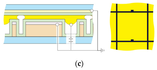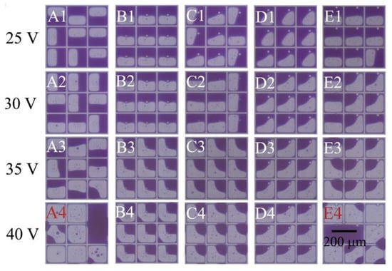 A “symmetry breaking structure” in the pixel facilitates directional openings to achieve image/pixel symmetry consistency. The design of a symmetry breaking structure also increases the local electric field so that the oil film opens near to or above the symmetry breaking structure. The effects of the first effect, breaking the symmetry of the square pixel, thus determine the location of the oil film rupture and effectively guide the ink movement to a specific place inside the pixel, as can be seen in Figure 7 [12].