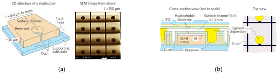 - Heikenfeld, J.; Zhou, K.; Kreit, E.; Raj, B.; Yang, S.; Sun, B.; Milarcik, A.; Clapp, L.; Schwartz, R. Electrofluidic displays using Young-Laplace transposition of brilliant pigment dispersions. Nat. Photonics 2009, 3, 292–296. [Google Scholar] [CrossRef]