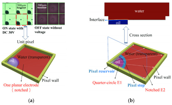 In display theory, the basic principle of electrowetting has been demonstrated to apply in confined pixels. The surface wettability change between the hydrophobic (oleophilic) state and hydrophilic (oleophobic) state causes a switch between the “on” and “off” status in each pixel unit. Tang et al. [3] illuminated the mechanism of oil film opening and predicted the threshold voltage based on the electro-capillary instability of the oil–water interface in the pixel. Zhou et al. [4] formulated a theoretical model of dynamic electrowetting display to predict the opening rate of oil film.