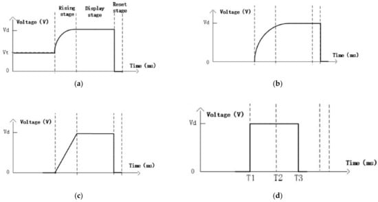 A more functional driving waveform is based on the modified PWM square waves, as shown in Figure 11 [24]. The faster rising rate results in a shorter ink rearrangement time after oil film rupture [25]. When a sharp driving waveform is applied, the oil film breaks into oil drops which move to different corners; a process called oil splitting [15]. Slow waveforms, such as sinusoidal waveforms (as shown in Figure 11b), on the other hand, can effectively reduce the oil splitting and slowly open the pixel. However, the rising time is long, which limits the response rate. Therefore, the rising voltage waveform—as shown in Figure 11a—that is employed to start from the threshold voltage and rise to the pixel opening voltage in the form of a sine wave, not only improves the opening rate, but also reduces the oil splitting effect.