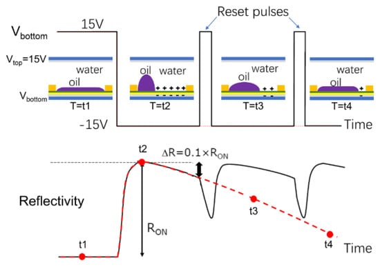 When a voltage is applied, the oil film opens and the oil ink is pushed towards the corner of the pixel. After a certain period of time, some ions from the liquid electrolyte enter the insulation layer and are trapped, thus causing ink “backflows” [26]. The experimental results showed that when an alternating current voltage is applied, the captured charge can be repeatedly released and recaptured [23]. Therefore, the charge capture behavior can be controlled by applying the alternating current signal so as to limit the ink backflow effect and improve the display stability. As shown in Figure 12, an initial voltage of 15 V is applied to both upper and lower plates, the voltage difference is 0 and the oil film remains in place. When the bottom voltage changes to −15 V the pixels slowly open to show the state at T2, and the ink shrinks to the corner of the pixel. At T3, due to the charge capture, the oil droplets gradually flow back. If the reflectivity is reduced to one tenth of the maximum value, the voltage between the plates is set to 15 V. In this way, the trapped charges are neutralized. Once the signal is set to −15 V, the reflectivity will rise again. A periodic reset will ensure a stable and high reflectivity.