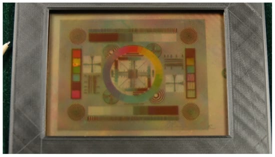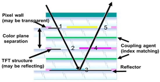 The color system for this display is based on a cyan, magenta, yellow subtractive color system. This means that three layers of color have to be assembled and separately driven. Therefore, displays have to be aligned accurately, substrate thickness has to be minimized to limit parallax (Figure 13) and light losses have to be minimized in order to achieve brilliant colors.
