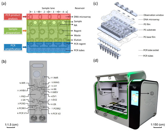 Illustration of the microfluidic system. (a) Schematic of CARD. A CARD contains 4 sample lanes, and each sample lane can be divided into 3 functional areas, a sample preparation area (green area), a PCR amplification area (blue area), and a PCR product analysis area (red area). (b) The structures contained in a sample lane. 1.PRD (Purification drive), 2.PCRD (PCR drive), 3.SR (Lysis reservoir), 4.EV1 (Elution valve 1), 5.EV2 (Elution valve 2), 6.PCRR1 (PCR reservoir 1), 7.PCRR2 (PCR reservoir 2), 8.PCRV1 (PCR valve 1), 9.PCRV2 (PCR valve 2), 10.ER (Elution reservoir), 11.HYBV (Hybridization valve), 12.MAG (Magnet), 13.LV (Lysis valve)), 14.RR (Reagent reservoir), 15.WEV (Washing and elution valve), 16.WR (Waste reservoir), 17.NAR (NA reservoir). (c) The 3D exploded view of CARD. CARD is mainly consists of 7 parts: observation window, DNA microarrays, PS film, PS substrate, PS base film, PCR tube socket, and PCR tubes. (d) The complete prototype of the custom-made operating platform, ① Touch screen for running control programs and obtaining test results, ② the 3D mobile module loaded with the reagent addition module and CCD camera, ③ micropipette tips placement slot, ④ the tank for placing the kit reagents, ⑤ manifolds for CARDs, ⑥ sample placement slot.