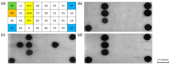 The DNA microarray for reverse dot hybridization assay to detect multiple genotypes of HPV is made of a negatively charged nylon membrane (PALL corporation, New York, NY, USA) with high-density carboxyl groups on the surface, which can bind the target to the surface of the membrane by covalent bond. The size of the DNA microarray is 9.6 mm (length) × 4.5 mm (width), and the thickness is 279.4–330.2 μm. The microarray contains 18 hrHPV probes and 6 lrHPV probes. As shown in Figure 2a, the dot matrix of HPV probes was set to 4 × 8 matrix, and the positions of probes were evenly distributed on the membrane. It can be used not only for single genotype detection, but also for detecting compound genotypes. Refer to Figure 2b–d for test results examples. The DNA microarray also has 3 Internal reference control (GB) probe sites, 3 Spot Controls (SP) probe sites, 1 Negative Control (NC) probe site, and Blank Control (BC) probe site. GB is a conservative sequence of human β-globin, and the 3 GB probe sites are 3 different concentrations of GB probes (GB-H 50 μM, GB-M 20 μM, GB-L 2 μM). In practice, when we use this microfluidic system for sample detection, sometimes the cell concentration in the sample is low, resulting in low human globin gene content, but as long as the test result is positive for GB-H, it means the extracted nucleic acid meeting the testing requirements, regardless of whether GB-M and GB-L are positive, there is no effect on the result determination. However, if the GB-H site is negative in the test result, it means that hybridization process may have failed, and the sample needs to be tested repeatedly. If GB-H is still negative in the result of repeated testing, it indicates that the sample collection does not meet the requirements. SP is a 19-base thymine sequence modified with 5′amino and 3′biotin to monitor the color development process. If the 3 SP points in the result are negative, it means that the color development has failed. NC is the same as that of the SP, except that there is no biotin modification at the 3′end of the sequence, while BC has no probe sequence and only contains probe diluent. If BC or NC in the result is positive, it means that contamination occurred during the experiment and the test failed. Only when the three SP sites and GB-H site on the microarray are positive, can the positive or negative results of other HPV genotype probe sites be reliably determined.