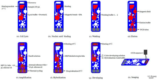 The microarray-based reverse hybridization technology, solidifies the DNA probes on the surface of the support in an orderly manner by microprinting, then the polymerase chain reaction (PCR) products are hybridized with the probes in situ, and the hybrid products are revealed by enzymatic reactions or by using fluorophores [13,19]. The application of reverse hybridization based on DNA microarray in HPV typing test has high sensitivity and specificity compared with the existing HPV detection technology, which can be used for simultaneous detection of multiple genotypes in multiple samples [20,21,22,23]. However, current microarray assay needs to be performed by separate instruments, which are cumbersome and risk of sample contamination. Moreover, some of these instruments, such as fluorescence scanners for signal visualization, are expensive and bulky instruments that can only be obtained in well-equipped laboratories [24].