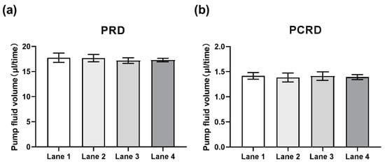 Characterization of pumping precision. (a,b) Under the preset working conditions (69 kPa, −55 kPa, 10 Hz), the PRD and PCRD of each sample lane pumped liquid volume at one time. Error bars represent standard deviation (n = 3).