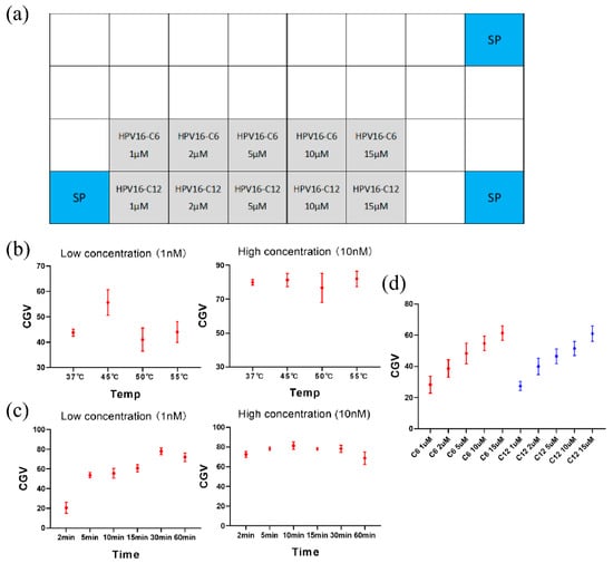 The reverse dot hybridization assay is a key step in determining the HPV genotype in the sample. Therefore, we have optimized the operating conditions of reverse dot hybridization assay, including the optimal hybridization temperature and hybridization time. Meanwhile, we also tested the effects of different probe concentrations and different modified probes on the hybridization results. Considering that the HPV16 genotype is the most carcinogenic and most infectious genotype in the world, we chose HPV16 as a representative to optimize the hybridization process. We diluted the two modified HPV16 genotype probes (C6 and C12) to different concentrations (1 μM, 2 μM, 5 μM, 10 μM, 15 μM) to make the DNA microarray as shown in Figure 5a. Different concentrations of HPV16 genotype plasmid (10 nM, 1 nM) were absorbed 15 μL, added to the CARD PCR tubes, and then 10 μL silicone oil was added. Next, the PCR tubes were buckled into the PCR tube socket, and the CARD was placed on the manifold of the operating platform. The temperature was set to 37 °C, 45 °C, 50 °C, and 55 °C, and the time was set to 10 min. The CGV of the HPV16-C12 10 μM probe site on the DNA microarray was selected for data processing and analysis. According to the temperature optimization results, the temperature is set to the optimal temperature, and the time is set to 2 min, 5 min, 10 min, 15 min, 30 min, 1 h, other experimental conditions remain unchanged. Similarly, the CGV of HPV16-C12 10 μM probe site on DNA microarray was selected for data processing and analysis.