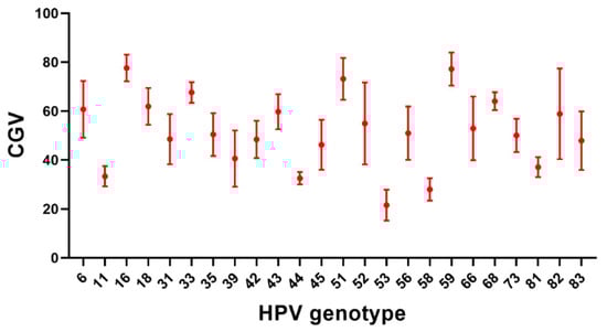 The LOD is an important indicator for testing the performance of a detection tool. To evaluate the LOD of the microfluidic system for detecting 24 HPV genotypes, we used the national standard references containing HPV plasmids of 24 genotypes (1011 copies/mL) were mixed with HEK293 cells as simulated samples, and diluted to 107 copies/mL, 106 copies/mL, 105 copies/mL, 104 copies/mL, 103 copies/mL, 102 copies/mL. Simulated samples were tested with detection kits, each concentration sample was tested 2 times, and quality control was performed with negative and positive quality control products. According to the optimal reverse dot hybridization assay conditions, the detection is completed on the microfluidic system, the image results are obtained by the CCD camera, and the CGV results are obtained by the analysis software. The results show that when the concentration is not less than 103 copies/mL, the results for each genotype are positive. However, it is difficult to obtain stable positive results when the concentration is 102 copies/mL, so we confirmed that the LOD of the microfluidic system is 103 copies/mL. Figure 6 shows the CGV results of the 24 HPV genotypes when the sample concentration is 103 copies/mL. Since multiple HPV genotype primers are degenerate when designing the primers, the same degenerate primer has different specificities for different HPV genotypes, resulting in differences in amplification efficiency. In the subsequent hybridization process, some genotypes have less amplified products resulting in large differences in CGV test results. It can also be seen from Figure 6 that the microfluidic system has different detection sensitivity for different HPV genotypes at the same sample concentration. However, the multi-genotype HPV test kits that are frequently used in clinical practice and approved by the National Medical Products Administration of China, such as Human papillomavirus nucleic acid genotyping kit (flow fluorescence hybridization method) (Tellgen Corporation, Shanghai, China) have a detection limit of about 100 copies/test; another example is the Human Papillomavirus Genotyping Kit For 23 Types (PCR-RDB) (Yaneng Biotechnology Co., Ltd., Shenzhen, China), with a detection limit of 103 copies/mL. Compared with the above two kits, the microfluidic system should be able to meet the HPV multi-genotype clinical detection in most cases.