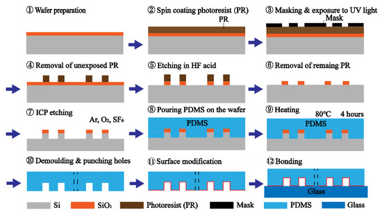 Figure 2 shows a schematic of the fabrication procedure. The mold of the microfluidic pattern was realized on a SiO2/Si substrate by photolithography. A layer of 30 μm photoresist was spin coated on the SiO2/Si wafer. A chrome photomask plate deposited with the microfluidic pattern was used in the photolithography. After UV exposure for 8 s, the photoresist exposed by the UV light was removed by the developer. Then, SiO2, which was not covered by the photoresist, was etched away by hydrofluoric (HF) acid. The remaining photoresist was removed by dimethyl sulfoxide (DMSO) at 80 °C. Si uncovered by the SiO2 was etched by inductively coupled plasma (ICP) etching using a mixture of sulphur tetra fluoride (SF6), oxygen (O2) and argon (Ar). The etch depth was 35 μm, which corresponded to the height of the microfluidic channel. After cleaning the wafer, the mold was ready for replicating the microfluidic pattern.