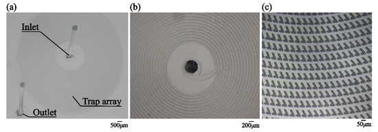 (a) Photo of the microfluidic pattern. (b) Microscopic image of the center of the microfluidic pattern. (c) Microscopic image of a group of cell traps.