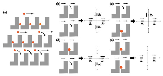 Figure 4b–e depict the equivalent circuit for the microfluidic structure. The inlet and the outlet are analogous to a voltage source and a ground terminal. The pressure drop between the inlet and the outlet can be regarded as a voltage drop from the voltage source to the ground terminal. The flow, corresponding to the current, is from the inlet (the voltage source) to the outlet (the ground terminal). According to the law of mass conservation (Kirchhoff’s current law), the flow (current) coming across an empty trap is divided into two; one keeps flowing in the main channel and the other enters the trap, as shown in Figure 4b. In both the branches, hydraulic resistance exists and affects the flow. The model of the hydraulic resistance is illustrated in Figure S1. The hydraulic resistance [36,37] in the main channel around the trap can be expressed as