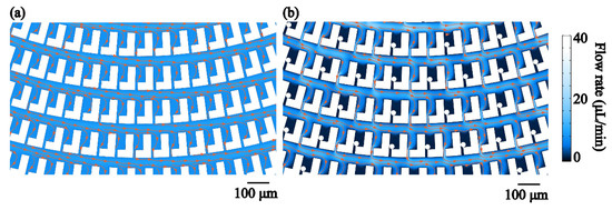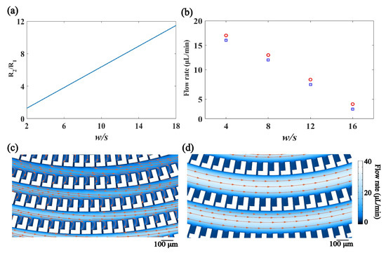 Figure 5a and Figure 6c,d demonstrates the flow in the microfluidic structure with the fixed dimension of the gap in the trap and the different width of the main channel. With the increase of the channel width, the flow rate in the main channel increases while the flow rate decreases in the trap. If the channel width is extremely large with respect to the dimension of the gap, the flow directly passes through the main channel and no flow enters the trap. Therefore, the width of the main channel should be comparable to that of the gap to ensure that the hydraulic resistance in the channel is similar to that in the trap so as to realize a balance in the flow division.