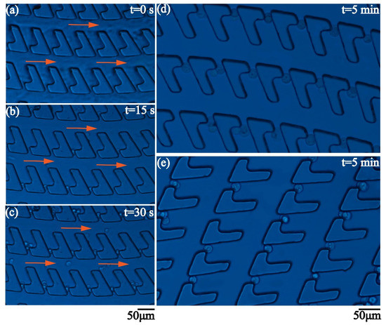 In the demonstration of cell trapping, 2 × 105 4T1 cells are diluted in 10 mL phosphate buffer saline (PBS). Then, 200 μL of sample is injected into the microfluidic chip at the flow rate of 40 μL/min. The size of the 4T1 cells has the range of 8 μm to 23 μm. Microscopic images of the cells are illustrated in Figure S5. The gap is 10 μm and the width of the main channel is 30 μm. The density of the traps is 120 traps/mm2. Figure 7a–c show the procedure of the cell trapping. The flow is unidirectional from the inlet to the outlet. When coming across the trap, the cells flowing in the spiral channel suddenly make a turn and enter the empty trap. If the size of the cell is much less than the height of the channel, the cell cannot completely block the gap and multiple trapping happens. The following cells would enter the trap until the gap is blocked. Once the gap is almost completely blocked, the trap becomes a dead end. The following cells would pass by the trap and keep flowing in the main channel due to the extremely high hydraulic resistance in the trap. The concavity of the trap is large enough to store several single cells or a large cell cluster. The flow in the main channel keeps a high flow rate and has no influence over the cells captured in the traps. The cell trapping is very efficient. Figure 7d,e show the different parts of the dentate spiral channel when the injection lasts for five minutes. Every trap captures at least one cell. The captured cells stably stay in the traps.