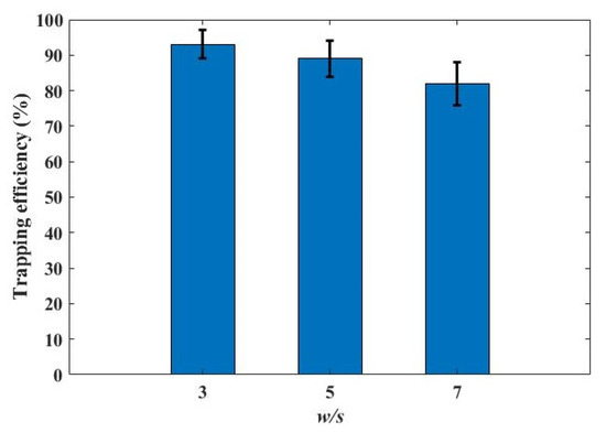 Cell trapping efficiency is investigated in the dentate spiral channels with the gap of 10 μm and the main channels of 30 μm, 50 μm and 70 μm, i.e., w/s = 3, 5 and 7. The total number of the cells injected into the microfluidic chip is nTotal and the number of the cells flowing out of the chip is nOut. The trapping efficiency is calculated as (nTotal–nOut)/nTotal. In the experiment, 4000 cells are counted by using a cell sorter (BD FACSMelody™ Cell Sorter) and injected into the chips. The cells flowing out of the chip are counted on a hemocytometer. Figure 8 shows the measured trapping efficiency. The error bars represent the deviation in the measurements for three times. In the dentate spiral channel with w/s = 3, a high trapping efficiency (>90%) is achieved. With the increase of w/s, the flow division to the main channel becomes dominant and the chance for the flow carrying the cells to enter the traps is reduced. As a result, the trapping efficiency drops. Thus, the dentate spiral channel with a very wide channel is not suggested for cell trapping.