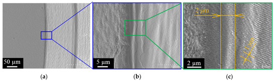 In this femtosecond laser trimming, the punch edge is sharpened as an intersection between the trimmed punch head and side surfaces. Due to the optical interaction between the scattering beams on the rough surface and the incident beam, the laser-induced periodic surface structuring (LIPSS) takes place together with the trimming processes [14,15]. Nanotexturing to diamond films by LIPSS is made by using the nanoablation via the femtosecond laser irradiation [13,14,15]. Under the laser irradiation conditions in the above, the LIPSS period is estimated to be 250 nm [17]. The LIPSS period is dependent on the fluence. Since the fluence is 0.265 J/cm2, it is estimated to be 0.5 of wavelength or 250 nm after [17,18].