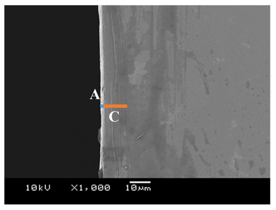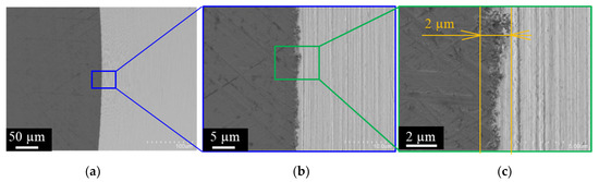 The diamond-coated punch with the sharp edge and nanotextured side surface was employed to pierce the electrical amorphous steel sheet similar to 3.2. Figure 8 depicts the SEM image of the second pierced sheet of work. WA and WC are reduced and no WB is detected in comparison to Figure 5; e.g., WA reduced from 10 μm to 2 μm, WB reduced from 40 μm to 0 μm, WC reduced from 30 μm to 10 μm, respectively.
