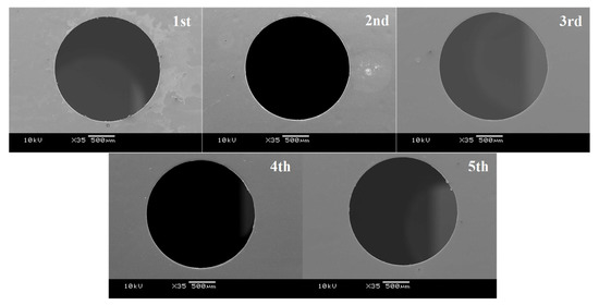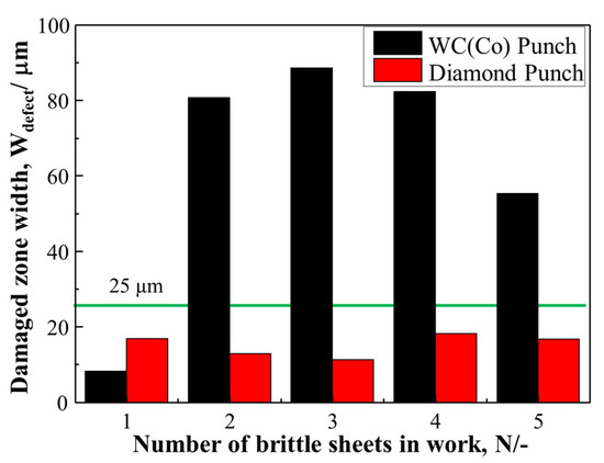At the number 2 sheet, three defects were generated in the pierced brittle sheets by using the WC (Co) punch even with inhomogeneous sharp edge profile; e.g., the measured damaged zone width is Wdefect = 80 μm as shown in Figure 5. When using the punch with an inhomogeneous sharp edge profile, the work surface is radially compressed in part so that the compressed area in part forms a peak and the un-compressed area is left as a valley. On the other hand, when using the diamond punch with the sharp edge and nano-structured side surface, Wdefect = 12 μm, as shown in Figure 8. This disappearance of wrinkling damages by WB = 0 μm comes from a uniform indention of the sharp edge. The whole work surface is uniformly compressed when using a punch with the homogeneous sharp edge profile. From the number 2 sheet to the number 5 sheet, Wdefect by the WC (Co) punch becomes much more than Wdefect by the diamond punch. This reveals that both the radial and circumferential defects (or B and C) are formed in the broader width by three times the sheet thickness.