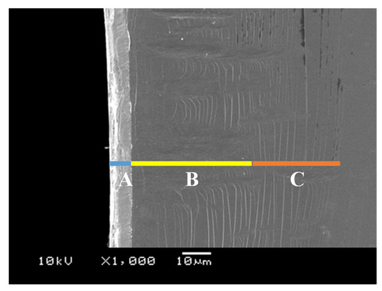 Among five sheets, the second pierced sheet was employed to describe the induced microstructure defects into the electrical amorphous steel sheet by piercing. Figure 5 shows the SEM image at the vicinity of pierced hole edge of the sheet. Three kinds of defects were induced into a sheet by this piercing; e.g., “A” denotes a droop-like defect, “B” is a periodic defect in the radial direction, and “C” is a circumferential cracking in alignment.