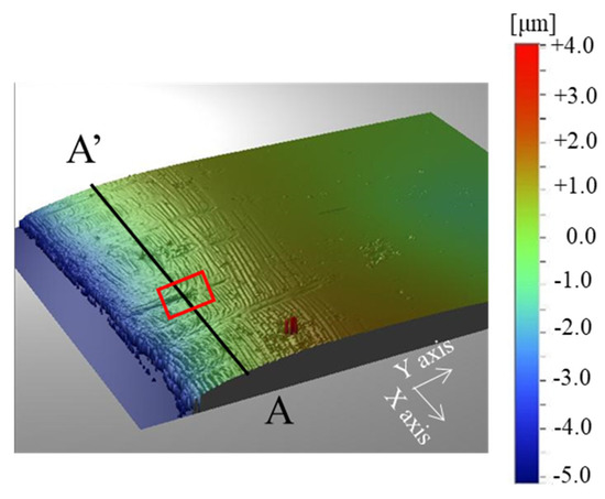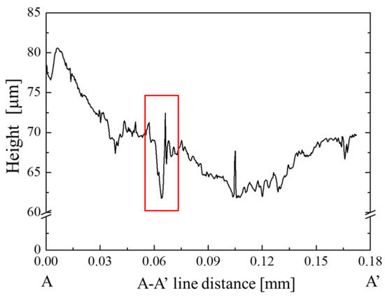 Figure 6 shows the three-dimensional shape measurement data that is shown in Figure 5. The measurement range was 0.18 mm in the circumferential direction (X-axis) and 0.25 mm in the radial direction (Y-axis). From this figure, the measured surface shape is gently mountainous from the end of the hole in the circumferential direction, and cracks are generated on the surface. Figure 7 shows the result of evaluating the cross-sectional shape of the “B” part of Figure 5 with the lines A-A′ in Figure 6. From this figure, there is a wrinkle with a height of 10 µm surrounded in red at 0.063 mm on the A-A′ line. From Figure 5, Figure 6 and Figure 7, the brittle sheet cracks circumferentially in the thickness of the sheet and at the vicinity of the pierced hole to form the A-type defect. Due to no ductile deformation, these cracks are induced by the indentation of the punch edge from the sheet surface into its depth. The B-type defect where the compressed sheet surface wrinkles with the periodic peak-to-valley structure in the circumferential direction. The circumferential cracks are noticed on the peaks of this defect. The C-type depicts an alignment of circumferential cracks. This multi-cracking behavior proves that each sheet in the stack is tensioned by piercing the punch to induce these circumferential cracking in series. After the piercing process, how three defects are formed in series is not easy to analyze from SEM images in Figure 5. A new experiment is necessary to explain the failure procedure to generate these damages before punch-out the sheet.