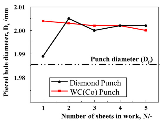 Figure 10 shows the inner diameter of the pierced hole among five electrical amorphous steel sheets when using two punches. D = 2.003 mm is the average of the pierced hole diameter by using the WC (Co) punch; D > Dp by 20 μm, irrespective of the number of sheets. On the other hand, when using the diamond punch, D = 1.989 mm, for the 1st sheet; D > Dp only by 4 μm. From sheet number 2 to 5; no difference was seen in D between piercing processes by two punches.