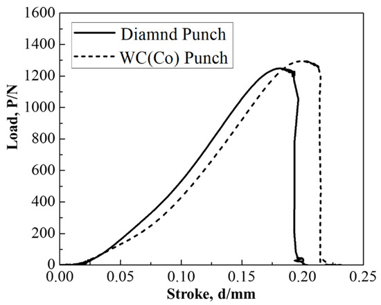 The load–stroke relationships are compared in Figure 11 to investigate the difference in mechanical response when piercing with the use of the WC (Co) punch and diamond punch. When using the WC (Co) punch, the maximum load (PMAX) was 1.3 kN and the maximum stroke (δMAX) was 0.23 mm. When using the diamond punch, PMAX was 1.25 kN and δMAX was 0.20 mm. This reduction of PMAX and δMAX comes from the decrease of applied energy by the stress concentration during the piercing process.