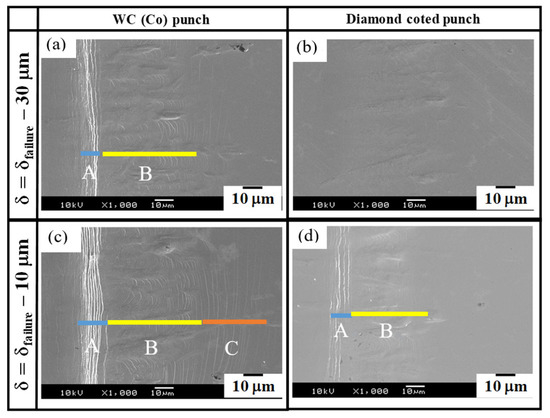 Figure 12 compares the surface damage on the third electrical amorphous steel sheet in the stacked work, induced at δ = δfailure − 30 μm and δ = δfailure − 10 μm, respectively, between the two punches. When using the WC (Co) punch, A-type and B-type defects were induced even at δ = δfailure − 30 μm, as shown in Figure 12, and C-type defect was additionally generated at δ = δfailure − 10 μm, as shown in Figure 12c. This proves that the circumferential cracks are significantly induced into the electrical amorphous sheets just before their complete punch-out. On the other hand, no defects were seen on the SEM image on the sheet surface at δ = δfailure − 30 μm when using the diamond punch as shown in Figure 12b. Even at δ = δfailure − 10 μm, only A-type defects, as well as weak B-type defects, were generated in the sheet as shown in Figure 12d. This weak B-type is formed by shallow wrinkles and no cracks have occurred.