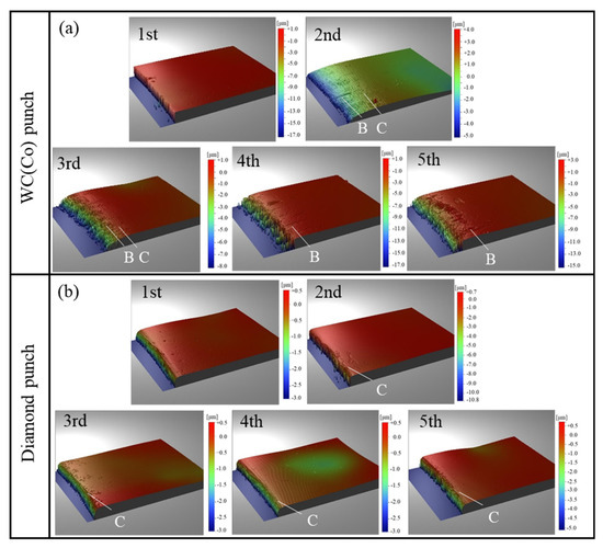 Figure 13 shows the surface profile of pierced sheets in the radial direction from the hole between two punches. When using the WC(Co) punch, the 2nd sheet to the 5th sheet have a B-type defect, and the 2nd and 3rd sheet have C-type defects that are shown in Figure 13a. On the other hand, when using the diamond punch, there are only seen in C-type defects from the 2nd to 5th sheet near the hole as shown in Figure 13b. The differences in the embossing behavior between two punches proved that deformation of the electrical amorphous steel sheet was suppressed by the stress concentration just below the diamond punch edge and that defects are induced by the stress redistribution in the radial and circumferential directions when embossing the electrical amorphous steel sheet by the WC (Co) punch.