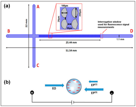 (a) Schematic representation of the microchannel employed, illustrating the dimensions of the channel and the asymmetric insulating posts. The device has a total of four reservoirs labelled A–D, where A is the reservoir where the sample was introduced. (b) Representation of the three main EK phenomena acting on the negatively charged microparticles in this system.