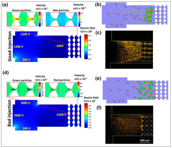 Figure 2 illustrates the effects of EP(3) on both EK injections. The COMSOL simulations (Figure 2a,d) are used to depict the electric field distribution to illustrate that a higher electric field magnitude was reached at the constriction regions between the insulating posts. Nonlinear EK effects became significant in these regions as a result of the higher local electric field magnitude. Additionally, shown in the Figure 2a,d are the overall particle velocities for both particles, depicted in the two insets above the channel image. These insets represent particle velocities as arrows, where the main difference between the “good” and the “bad” EK injections can be seen by observing the direction of the arrows. Under the voltages selected for the good EK injection, the overall particle velocity (Equation (8)) for both particles was towards the post array, that is, the particles were being successfully injected into the channel and could be separated by exploiting the differences in their electromigration. Particle velocity is represented by our COMSOL model as arrows and as the color surface plot. Under the voltages employed for the bad EK injection, it could be observed that particles exhibited negative velocities (velocity toward the inlet, reservoir B) at the entrance of the post array, which caused a significant adverse effect on the quality of the injection by preventing the particle from successfully entering the post array. The velocity insets for both particles clearly depict these negative velocities as predicted by the COMSOL model. Figure 2b,e illustrates cartoons of the behavior expected by both particles in both injections. Furthermore, Figure 2c,f demonstrates that the experimental results matched the predictions made with the COMSOL mathematical model. As predicted, the voltages used for the “good injection” resulted in a successful sample injection where both particles entered the post array. In contrast, the voltages employed for the “bad injection” resulted in particle agglomeration and trapping at the entrance of the post array, thus resulting in a problematic injection.