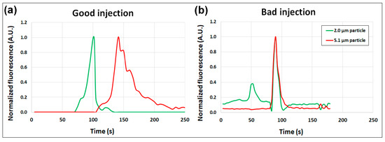 Electropherograms obtained (a) a good injection and (b) a bad injection. Fluorescence signals were captured at a selected observation window located at the end of the post array, as depicted in Figure 1a.