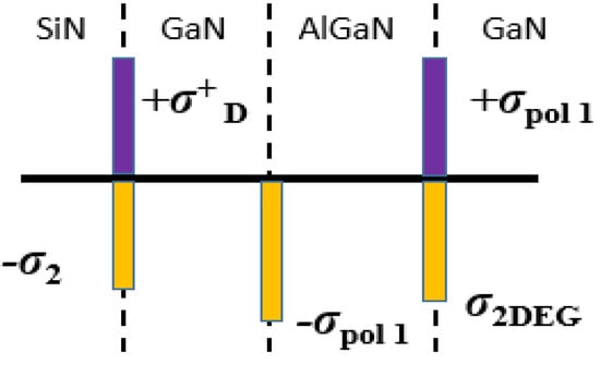 The charges for GaN/AlGaN/GaN device at each interface are defined as shown in Figure 2 for the physical simulator [39]. The effect of strain relaxation on the piezoelectric charges was not accounted for simulation [40]. This strain relaxation would not affect the main moto of the paper which is to study the impact of donor-like traps and fixed charges on the HEMT characteristics. The fixed charges which were given at the interface of Si3N4 and GaN interface (σ2) were assessed by considering the trap charges related to the passivation layer composed with the piezoelectric polarization charges. Donor-like traps (σD) were also given at the same interface (Si3N4/GaN) [29,30,36] with some donor-like traps energy level.