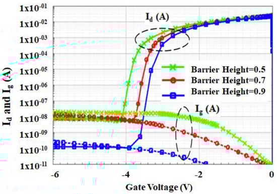In this paper, the simulation results carried out with Schottky barrier height value of 0.7 eV are in good agreement with the GaN wafer experimental data and the sensitivity of the barrier height on threshold voltage (Vth) and gate leakage current is shown in Figure 4. During the epitaxial layer, growth defects will be formed in the device [46]. The defect charges present in the device structure will also affect the breakdown voltage and advances the impact ionization coefficient due to the presence of an electric peak field at the edge of the gate electrode on the drain side [35].