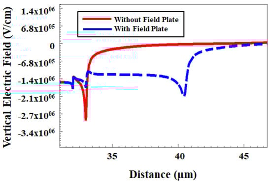 Simulated vertical electric field distribution with gate field plate and without gate field plate at 600 V breakdown voltage by drawing the cutline along X-axis in the 2DEG channel region.